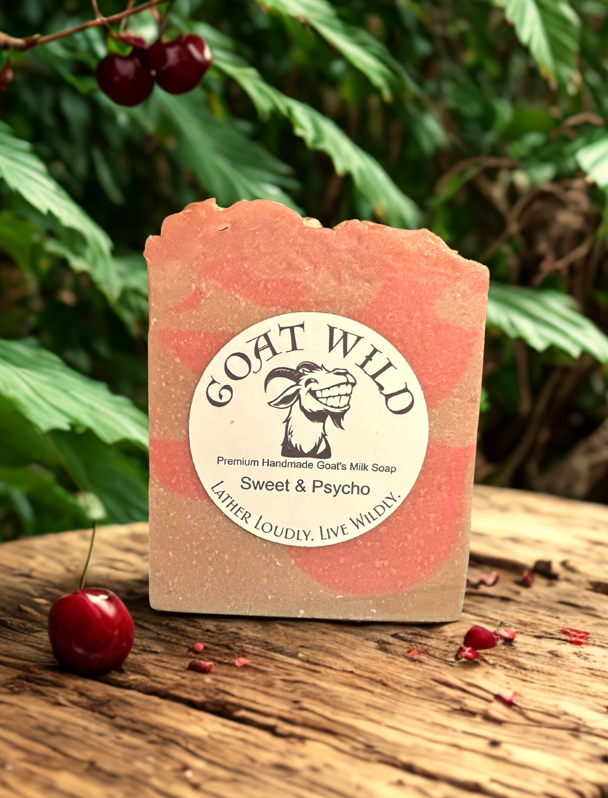 Unleash your wild side with Sweet & Psycho, our audacious goat milk creation that flips the script on what you expect. Tart cherry meets buttery almond in a flavor combination that's equal parts sophisticated and delightfully unhinged. This isn't your grandmother's goat milk soap—it's a sensory rebellion that dares your skin to feel the difference.